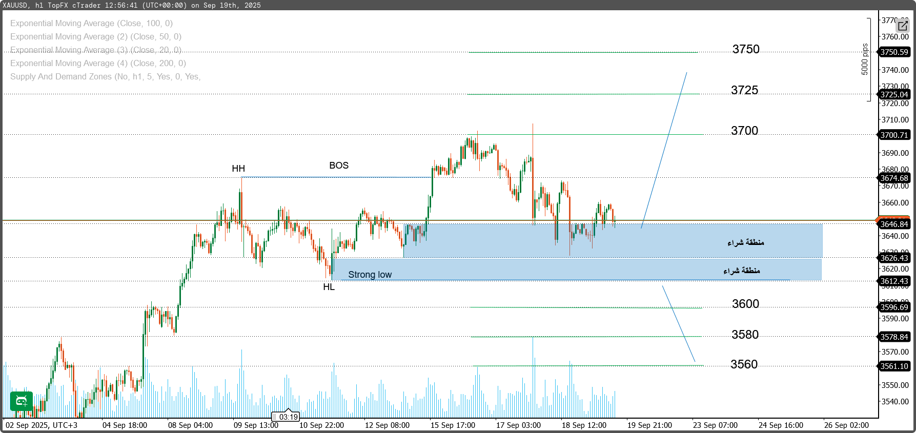 وقف الخسارة (SL): أسفل 3620 (خارج الـ Strong Low) → حوالي 3618.