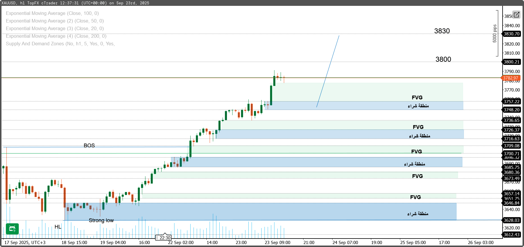 الأهداف: أولاً 3800 دولار (مستوى نفسي رئيسي) ثم 3830 دولار كمستوى مقاومة فني.