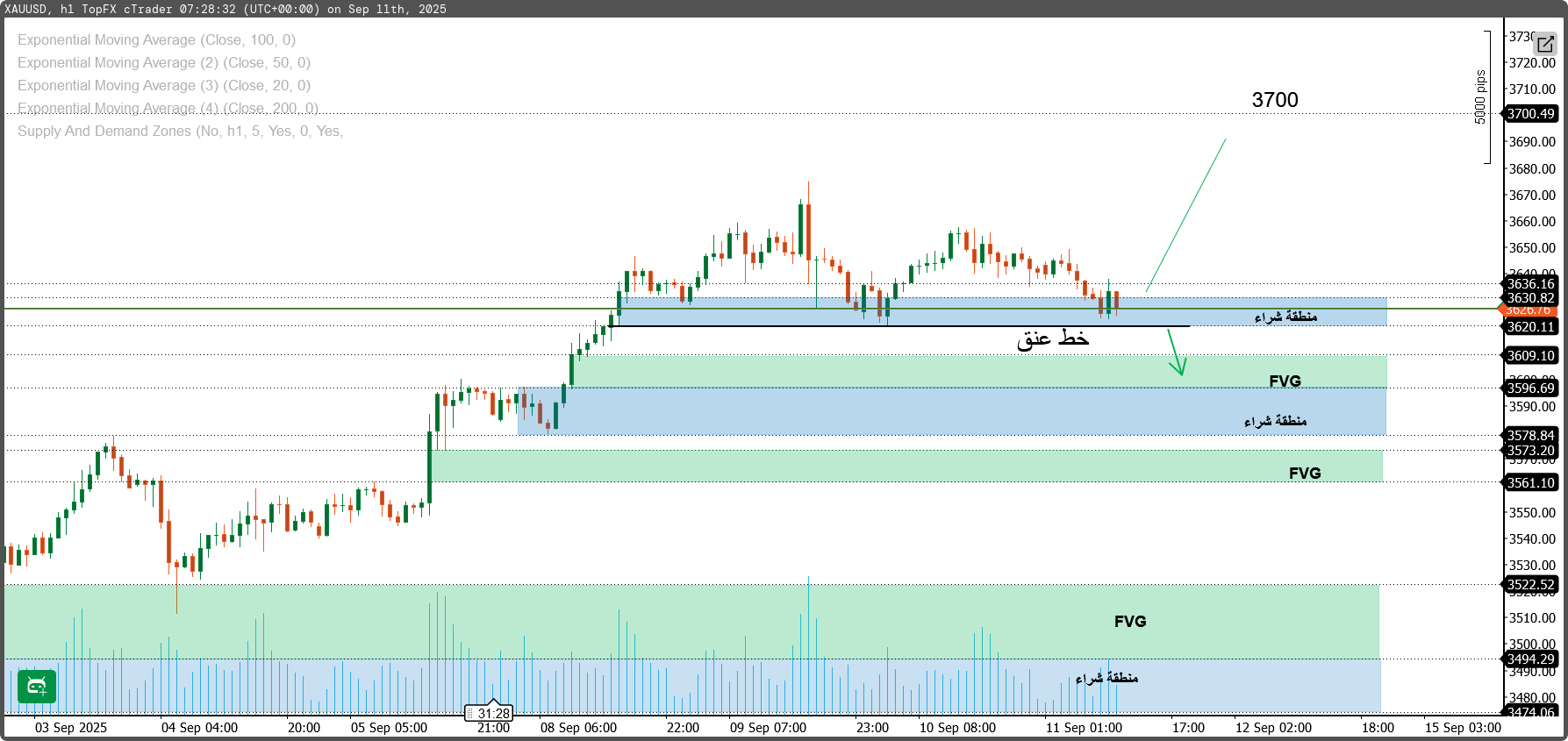 يرتكز على ارتداد السعر من منطقة الشراء عند 3620 – 3630$، مع ظهور شمعة صاعدة قوية على فريم الساعة.
