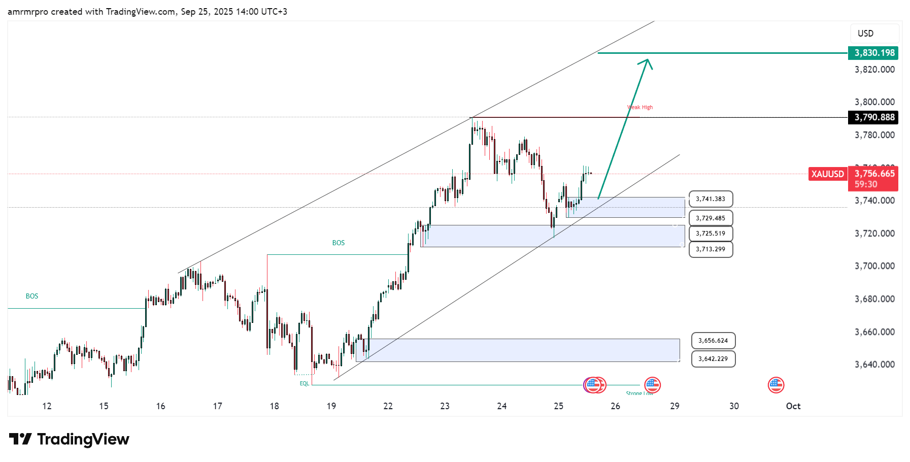 متابعة Break of Structure (BOS) للتأكد من اتجاه السوق، حيث أن كسر الدعم عند 3,725$ يفتح المجال لتصحيح أعمق.