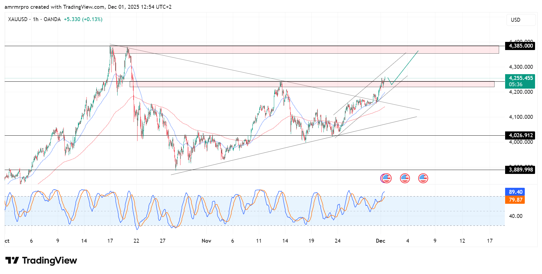 تاريخ التحليل: 1 ديسمبر 2025 الأصل المالي: الذهب مقابل الدولار (XAUUSD) الإطار الزمني: ساعة (1H)
